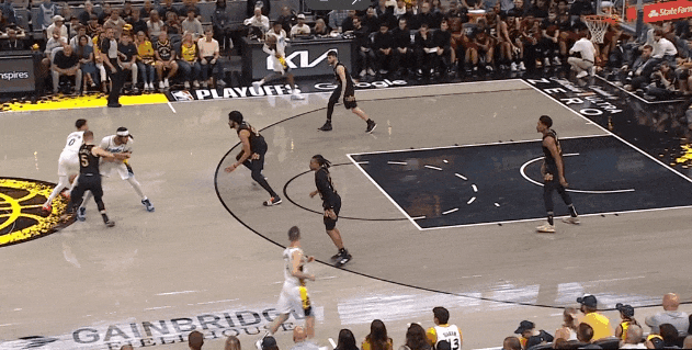 第二節初,米切爾和莫布里帶三個替補,被西亞卡姆繼續追打,單挑莫布里之外的任何人;等莫布里扣到西亞卡姆身上,西亞卡姆就找託平吃錯位:託平也不負所托,還帥氣地突破加蘭上反籃。