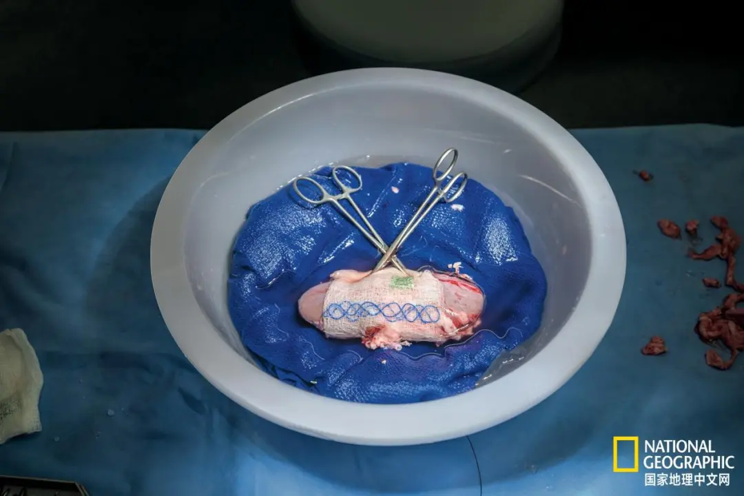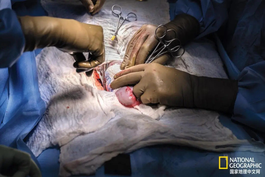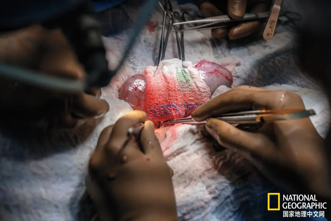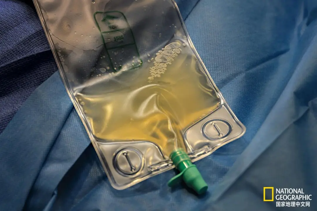 一旦蒙哥馬利(Montgomery)的團隊將豬的腎臟與患者大腿上部的血管相連,患者的身體就開始通過這個新腎臟產生尿液,其排尿水平與人類供體腎臟的排尿水平相近——這是手術成功的一個標誌。 |國家地理圖片集