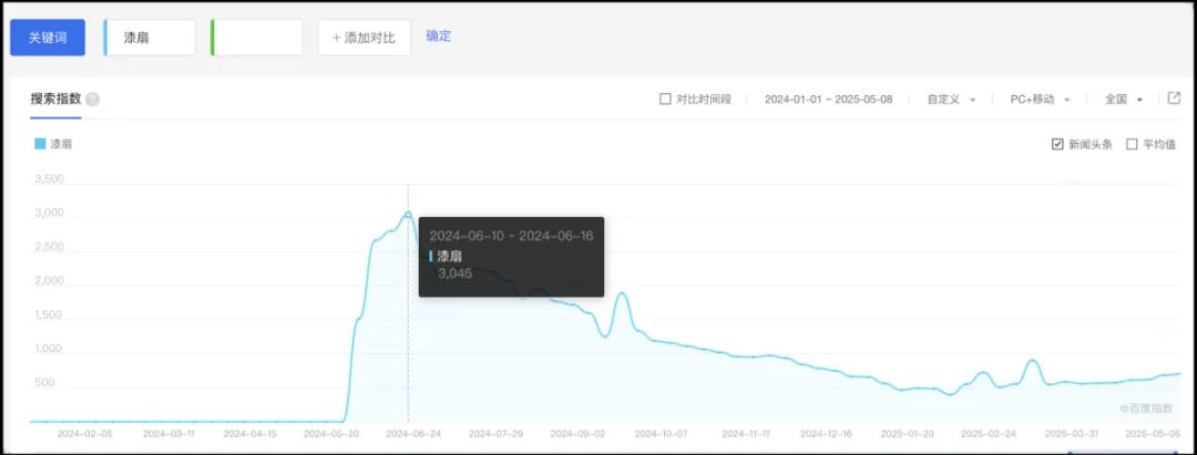 然而這類所謂的非遺漆扇,興起不過一年時間。百度指數“漆扇”也是從2024年勞動節之後才一路飆升的,大概有旅遊效應在推動。