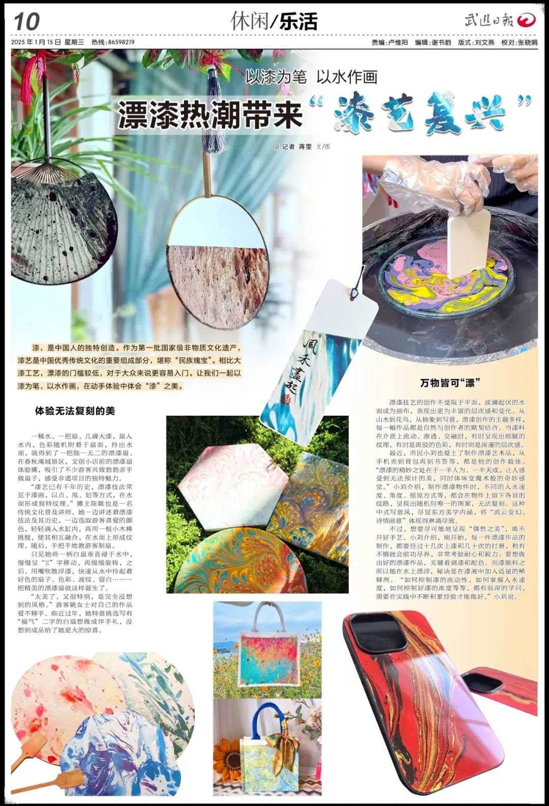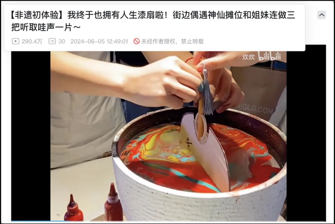 跟現代的水轉印技術的區別,就是沒有用活化劑噴薄膜這一步,而是直接用油性顏料在水面上畫畫的。操作還是挺麻煩的,沒法大規模量產。如今南方一些旅遊景點經常用“非遺漆扇體驗”作為宣傳噱頭,在路邊擺個大水缸,讓你自己“滴漆、攪動、浸染”,親手繪製扇面。