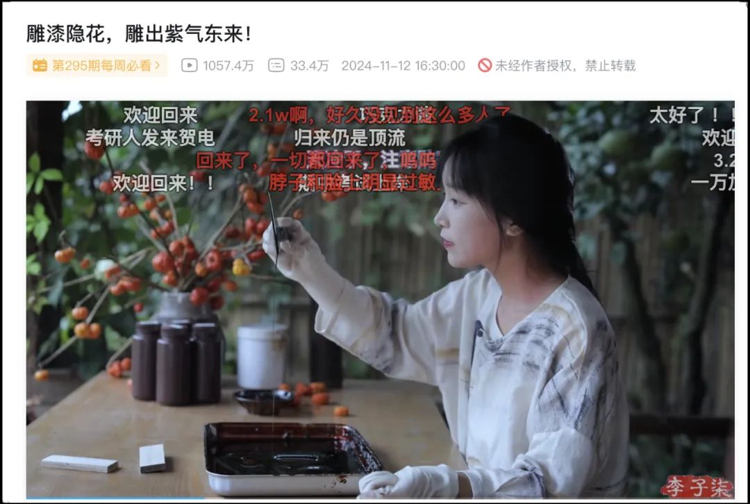 順帶一提,2024年11月李子柒曾經短暫復出更新過幾期視頻,其中就有一期講大漆的傢俱,感興趣的朋友也可以回頭搜一搜。