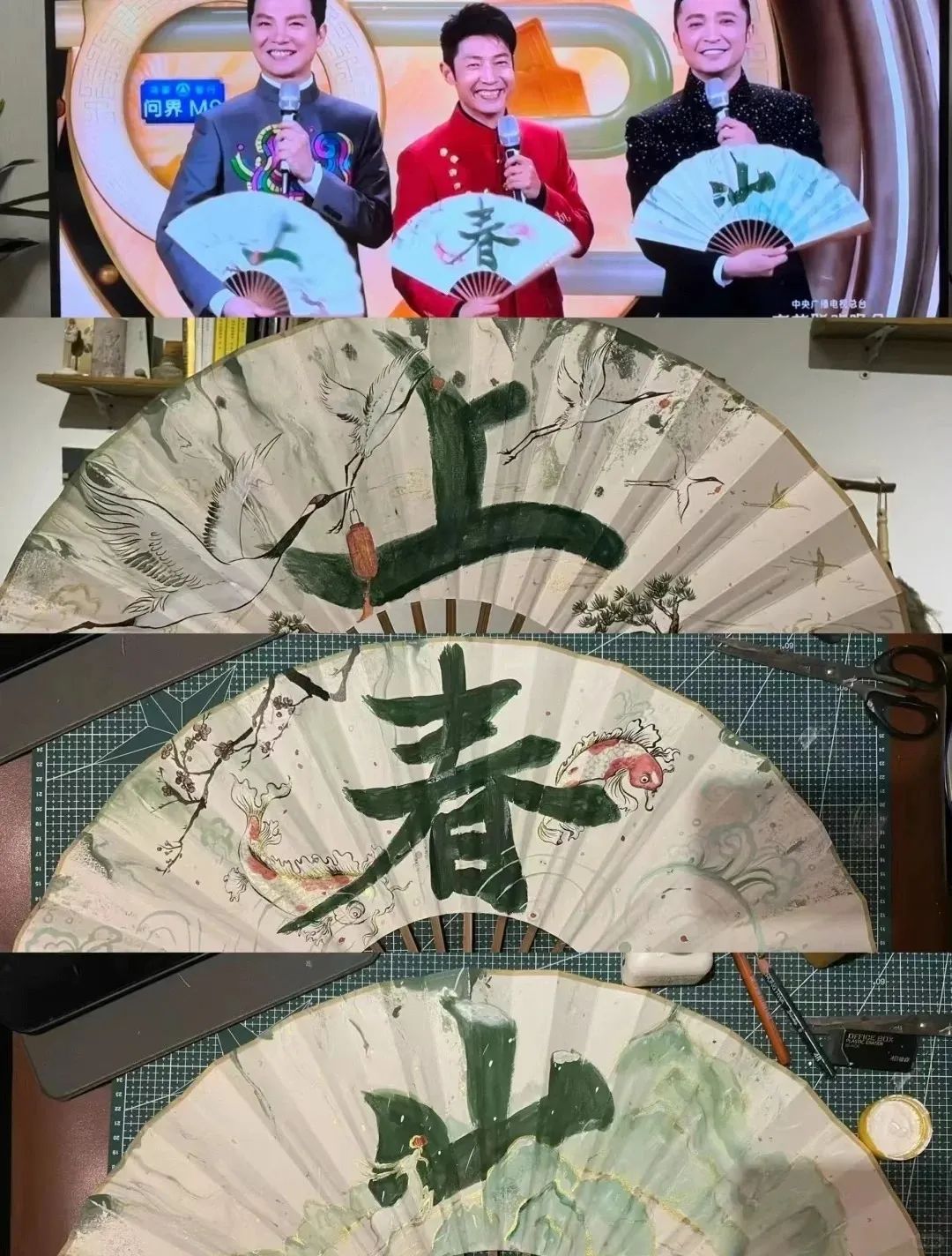 當事的流量小生現在還在打官司,到處告那些做“春山學”視頻的博主呢。但不重要,今天要講的是主持人報幕時候用的3把精美“漆扇”。