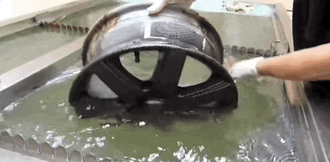 內容大概是水面鋪有一層墨水,工人把輪轂、槍械零件、垃圾桶、安全帽等任何有形狀的物體浸入水中,然後圖案就自動印到了表面。