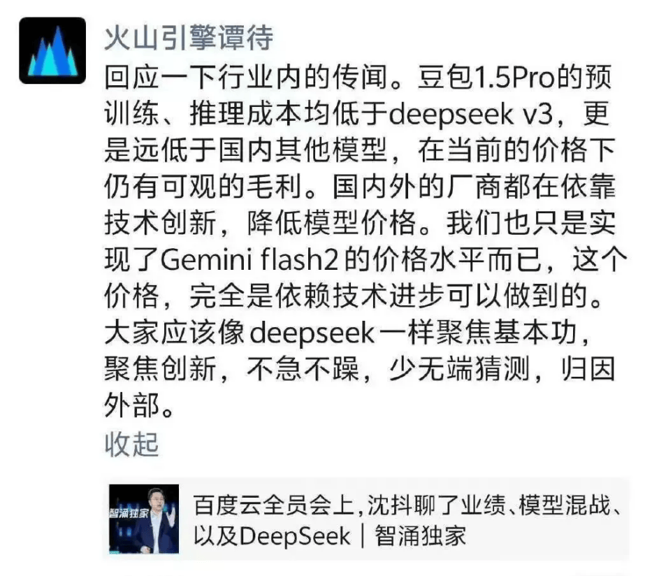 次日,字節跳動旗下火山引擎總裁譚待在朋友圈回應:模型價格降低是依靠技術創新,大家應該像DeepSeek 一樣聚焦基本功,少無端猜測,歸因外部。