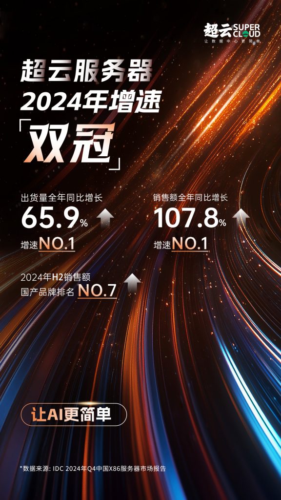 作為國產服務器品牌穩固第一梯隊的專業玩家,超雲2024全年出貨量及銷售額增速雙第一,其中出貨量全年同比增長65.9%,銷售額全年同比增長107.8%,均遠超行業平均增速。