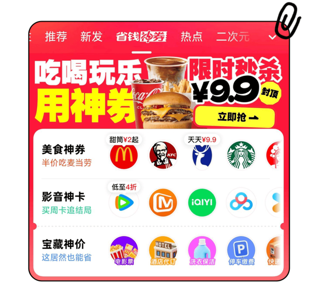 在阿里重新創業的浪潮下,閒魚已經衝在集團前列。今年五一假期前夕,閒魚發佈了覆蓋餐飲團購、軟件會員、酒旅票務等多種消費品類的“省錢神券”產品,其中麥當勞、肯德基、瑞幸、星巴克等餐飲到店兑換券是閒魚的主力產品。