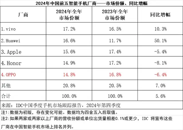 事實上,這還只是OPPO尷尬局面的一個縮影,更大的問題在於:作為主流廠商,OPPO在國內的基本盤有些失守。IDC數據顯示,OPPO的市場份額從2023年第一季度的國內第一,已經跌至2025年同期的第三,其中2024年全年則滑落至第四,年增長率為負6.4%,與年增長10.3%的vivo形成鮮明對比。