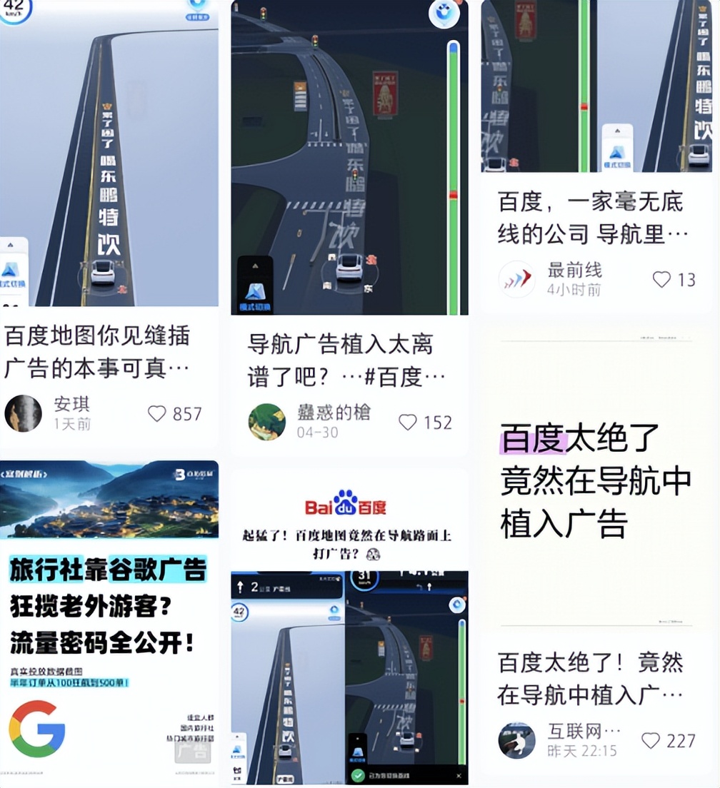但百度這次把廣告"種"在導航路面上,性質完全不同。導航軟件的核心是安全,是效率,是幫助用户"安全到達"。用户依賴它不是為了娛樂,而是為了準確高效、安全地到達目的地。當用户在開車時,注意力須高度集中,而路面上的虛擬廣告極易干擾視線,誘發誤判,後果可不是"多看一眼廣告"這麼簡單,而是威脅生命的交通事故。百度地圖此次將醒目的廣告內容"種"在導航路面圖像中,並強制展示、無法關閉,無疑打破了行業的基本安全紅線。