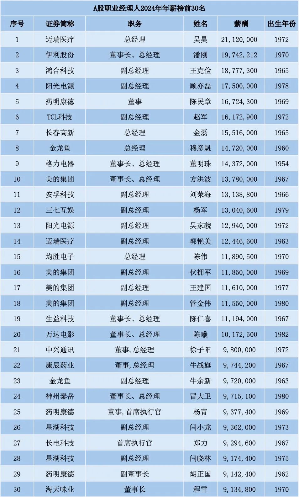 2024年A股高管薪酬排行榜:年薪最高4180萬,伊利潘剛身家超百億_風聞