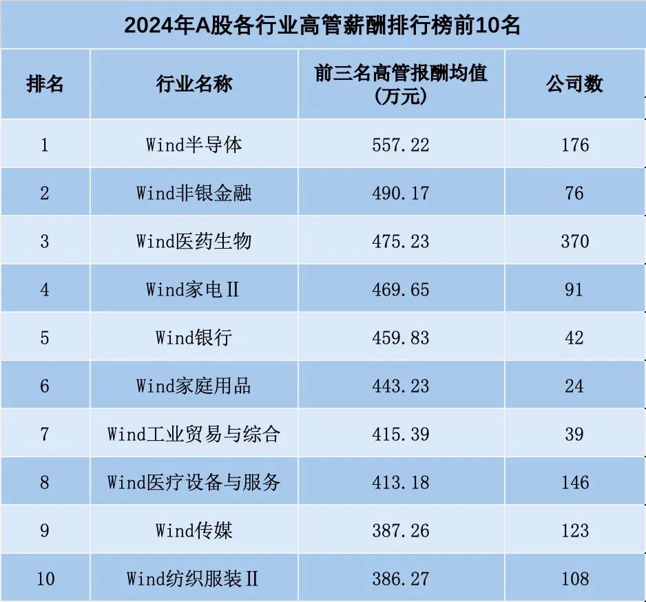 2024年,A股高管薪酬相對較高的行業是半導體、非銀金融和醫藥生物等領域。