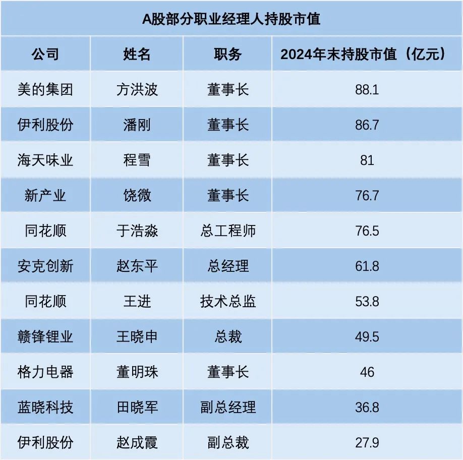 目前,A股有不少職業經理人持股市值突破了10億元,部分甚至超過了50億。
