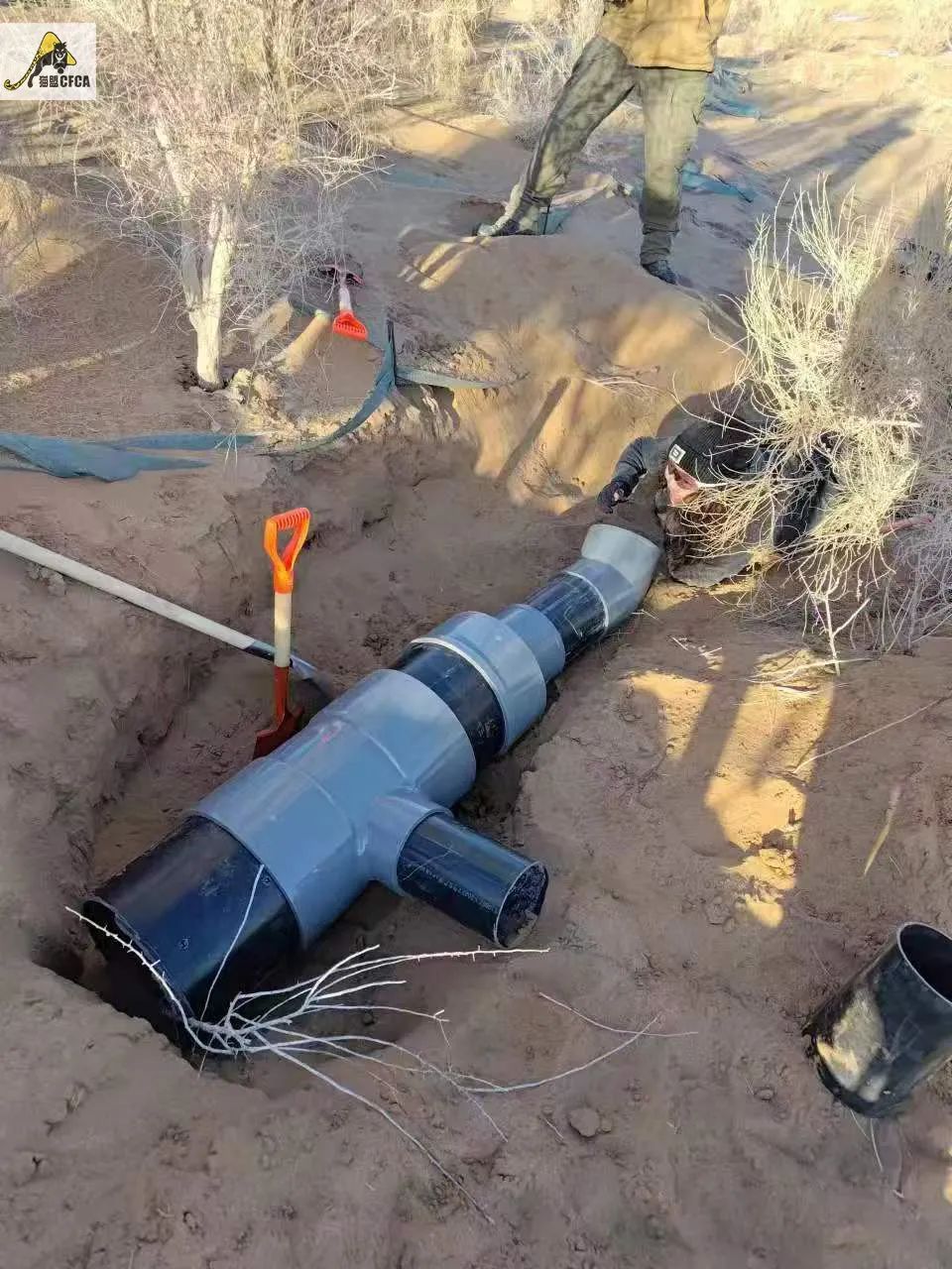 艱辛的搬運過程和折磨人的鋸管子的過程這裏就略過不表了,最終,我們拼接出來一個形似火箭筒的東西,它有三個不同朝向的出入口,為了透氣還在側壁用電鑽開了很多孔,因為擔心管道內壁太滑,心悦在管道內壁粘了一層毛氈。由於膠水的味道太大,我們決定留它在沙漠裏通風一晚,明天再來埋它。