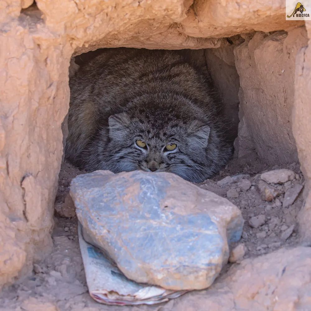 兔猻到底有多喜歡洞穴呢?再舉一個例子,去年的兔猻日,貓盟的工作人員和志願者在一處古長城的遺址發現,城垛子上掉落石磚留下的石室裏,躲着一隻兔猻。