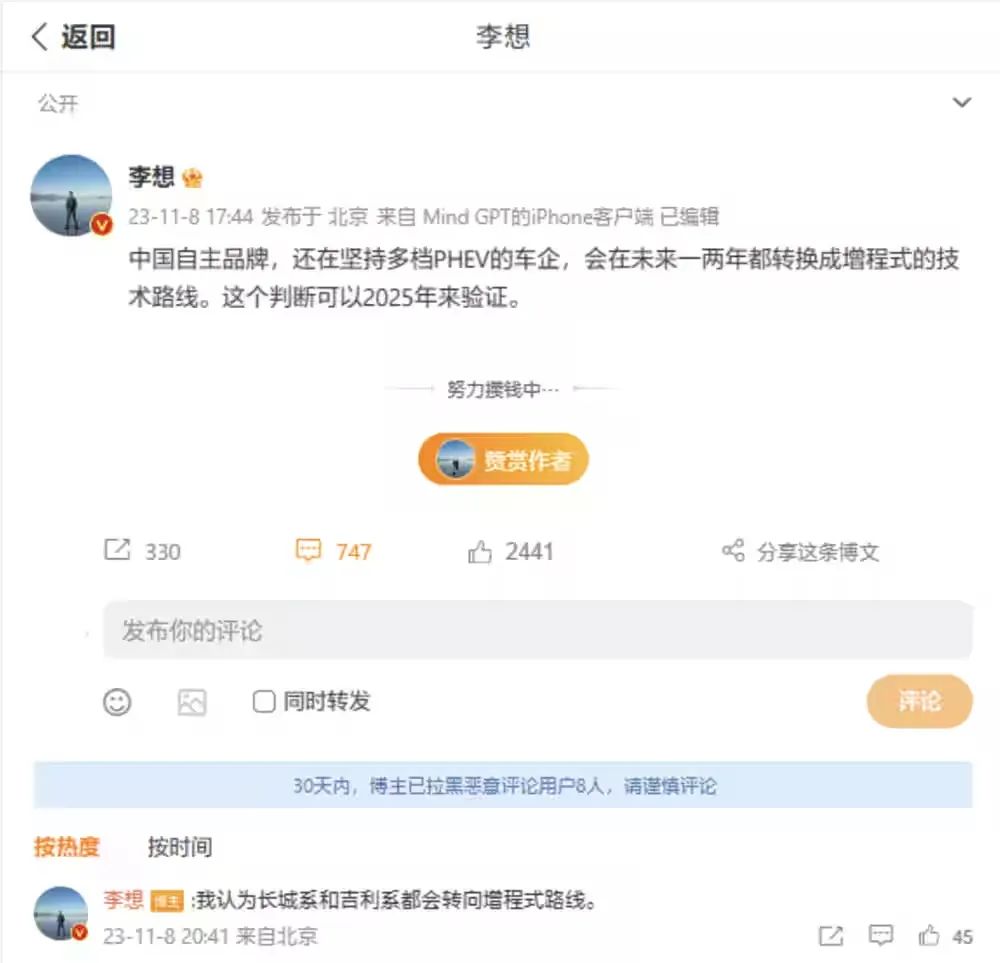 在2023年11月,理想汽車創始人、董事長兼CEO李想曾自信滿滿地預言,混合動力的新能源車裏增程為王。“我認為長城系和吉利系都會專項增程式路線。”李想補充稱。