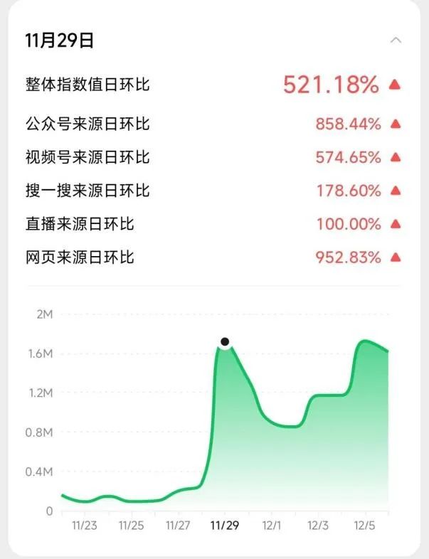 根據微信指數的數據顯示,在2024年11月29日節目上線後的第二天,謝添地整體指數值日環比暴漲521.18%,創造了又一個綜藝營銷的經典案例。