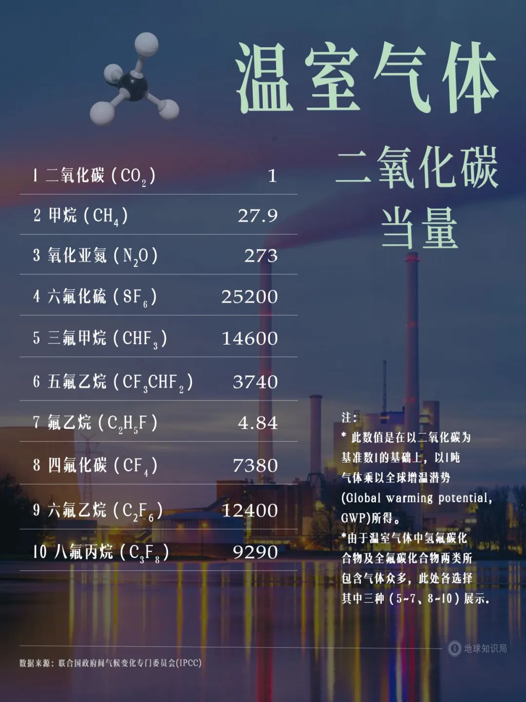 雖然70%以上的温室氣體都是二氧化碳,但也有一些並不含“碳”(碳元素)。常見主要温室氣體包括以下幾種——
