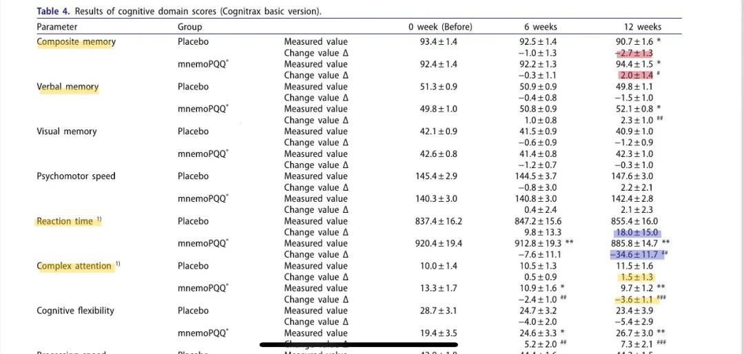 一項在日本進行的試驗,納入了58名年齡在40-80歲的志願者,干預組每天吃21.5毫克PQQ二鈉鹽,連續12周。結果發現,相比安慰劑組, PQQ組在認知功能的11個方面中的 7個方面(言語記憶、反應時間、複雜注意力、認知靈活性等)都有所改善。