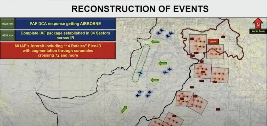 **回顧這場空戰的全過程,巴基斯坦空軍的反應堪稱迅速。**據巴基斯坦軍方介紹,當地時間7日0點10分,印度空軍第一波戰機起飛;僅2分鐘後,巴方就察覺到印軍的異常並觸發戰備反應;0點23分,巴基斯坦空軍戰機陸續升空,從預警到行動僅耗時11分鐘;0點37分,42架巴方戰機全部起飛並組成防禦陣型。印度空軍戰機在0點30分完成所有機羣起飛後,於0點40分左右在未越過邊境的情況下,發射空對地彈藥襲擊巴基斯坦境內目標。印軍完成對地攻擊後,巴方迅速通過電磁信號特徵標記所有發射對地彈藥的印度戰機,並在0點50分至1點10分左右,出動殲-10CE戰機,利用霹靂-15遠程空空導彈對已標記的印軍戰機發起致命攻擊。