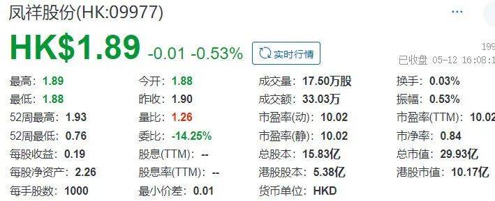 截至5月12日收盤,鳳祥股份的股價定格為1.89港元。對比其登陸港股時的發行價3.33港元,縮水明顯。總市值也從上市當日的47億港元,下降至目前的不足30億港元,蒸發了近4成。