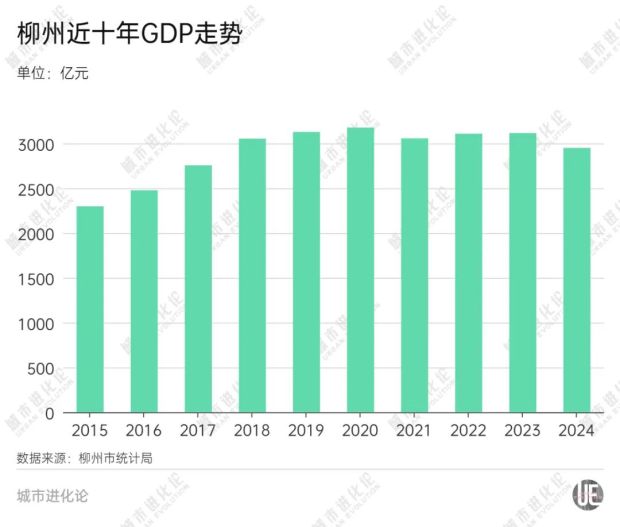 如果將時間維度拉長,柳州GDP實際上已經多年停滯不前。從2018年起,柳州GDP就在上下浮動,沒有形成實質的增長態勢,2024年的GDP(2950.67億元)甚至比2018年(3053.65億元)更低。
