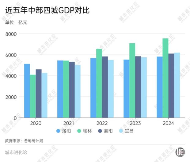 不過在2022到2023的兩年時間內,洛陽接連被三座中西部城市趕超。2022年,榆林GDP超過洛陽;同一年,湖北襄陽GDP也超過了洛陽;第二年,湖北宜昌也實現反超。