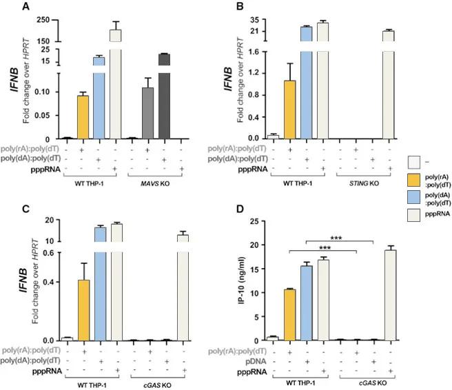 為研究RNA-DNA複合物誘導的免疫激活機制,Arun K Mankan等學者分別構建了cGAS、STING與MAVS缺失的THP-1細胞系,並導入雙鏈DNA、pppRNA和RNA-DNA複合物,結果顯示RNA-DNA複合物可能通過cGAS-cGAMP-STING路徑引發免疫反應,為抗病毒機制的深入解析提供了有力證據。