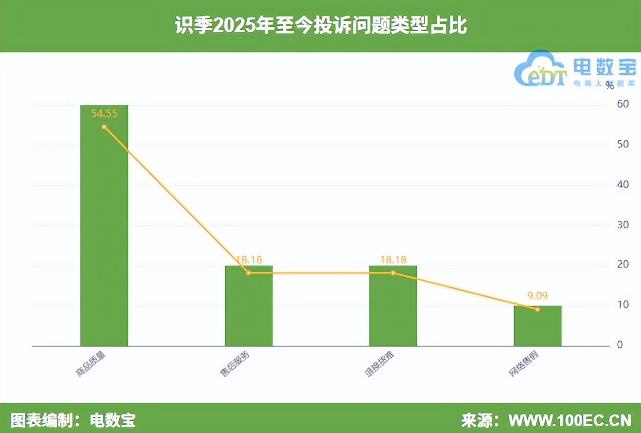 此外,“電訴寶”受理用户維權案例顯示,“識季”還涉嫌存在商品質量、售後服務、退換貨難、網絡售假問題。
