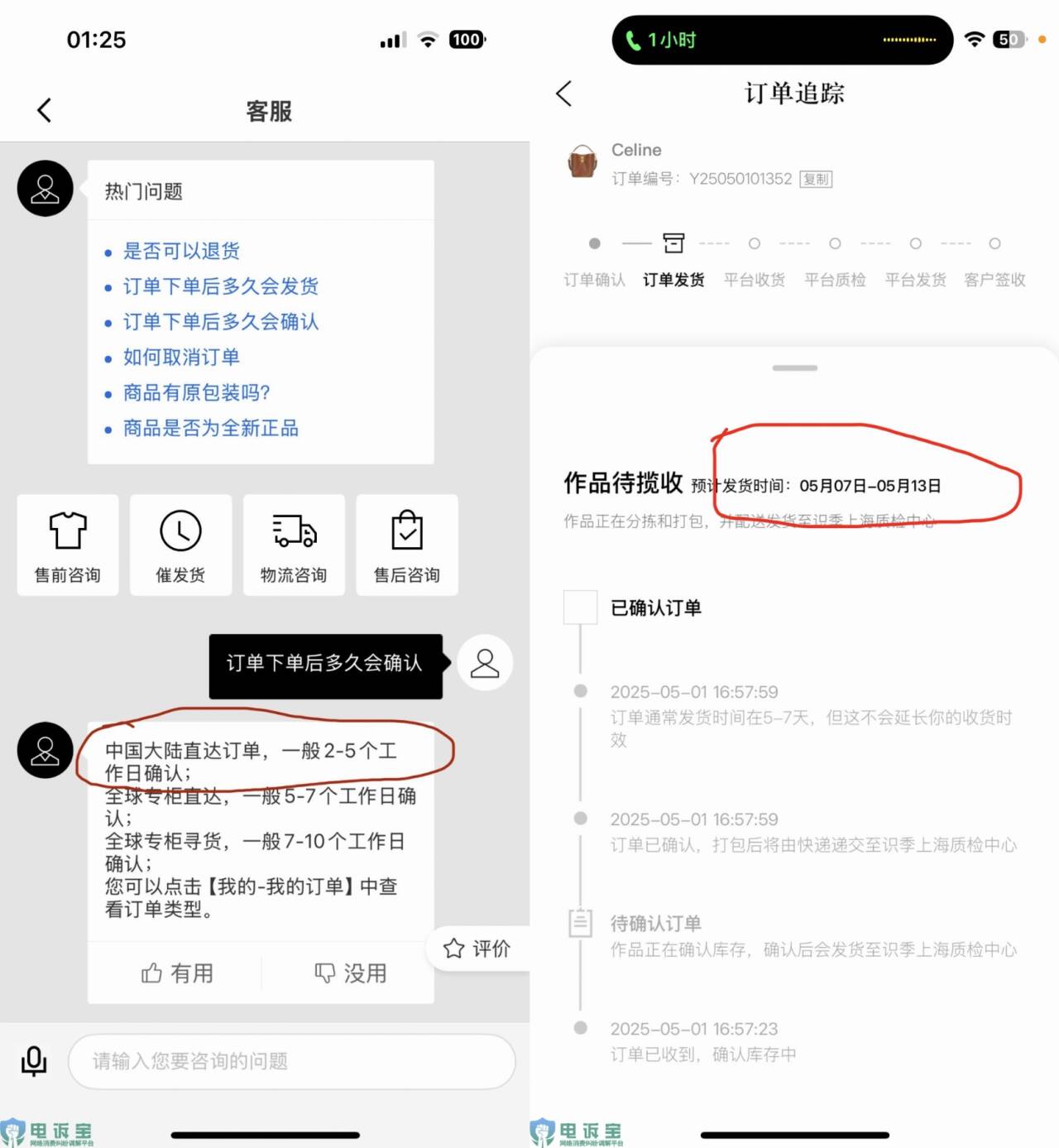 5月4日,江西省的帥女士向“電訴寶”投訴稱其於5月1日在識季平台下單購買商品。由於當時有出行計劃,她特意選擇了承諾8天內送達的商品。然而付款後她才發現,其中一單商品的發貨時間實際超出了承諾範圍。她立即聯繫客服要求取消訂單,但客服以"訂單已確認"為由拒絕。經查,系統顯示訂單確認時間為16:57:59,從付款到確認僅間隔36秒。