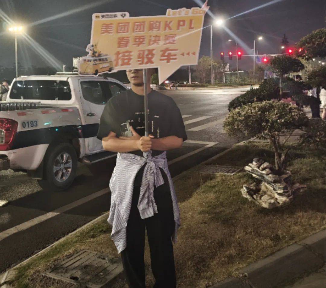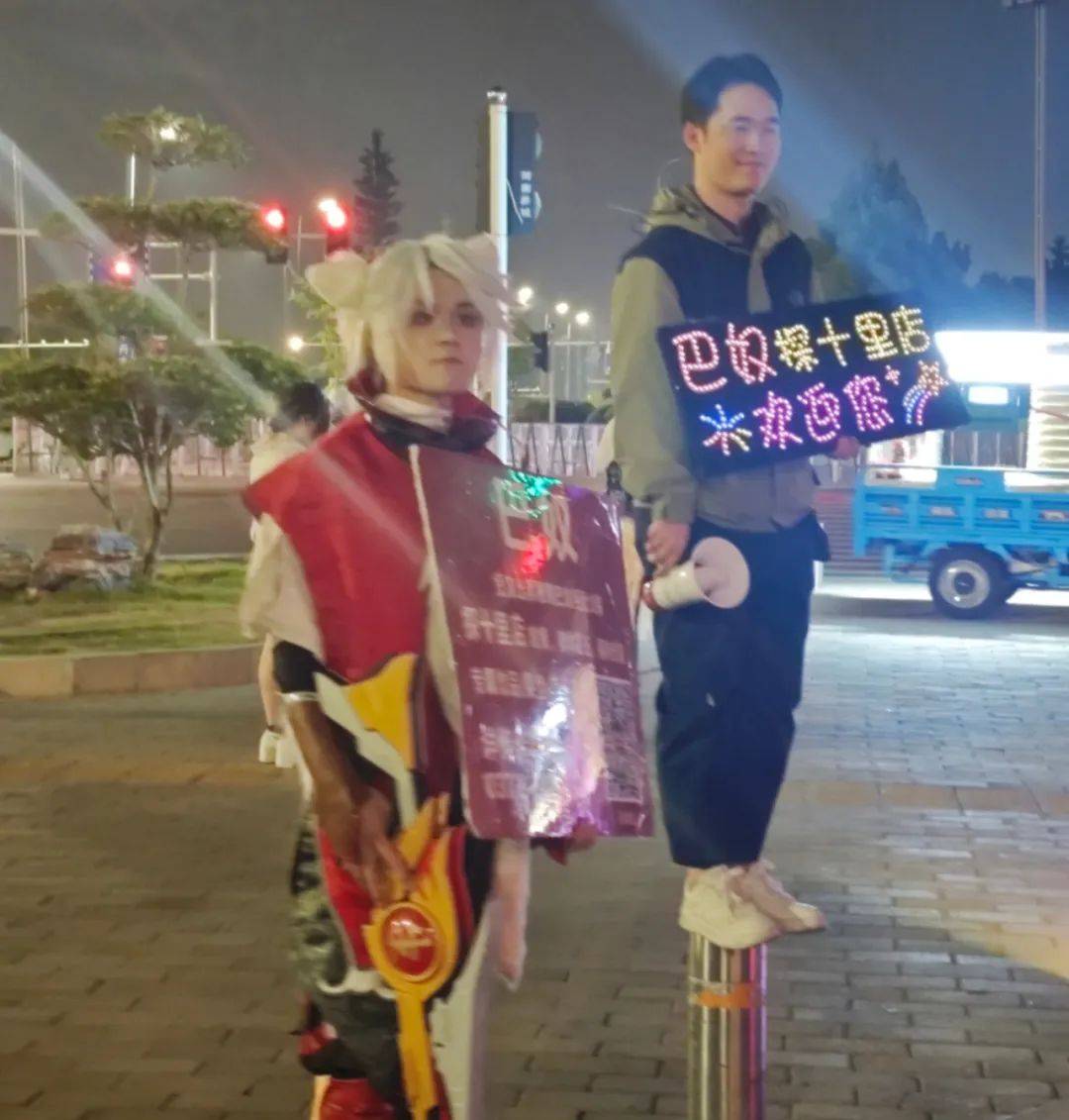 比如本次賽後,多家餐館在體育場門口舉起了牌子,其中還有鄭州知名餐飲企業巴奴火鍋,上面寫着「車接車送」,不少牌子旁還站着遊戲角色的Coser。散場後的體育場本就難打車,「暗號正確」的遊戲Coser更是直接讓商家們接走了一批又一批現場粉絲。