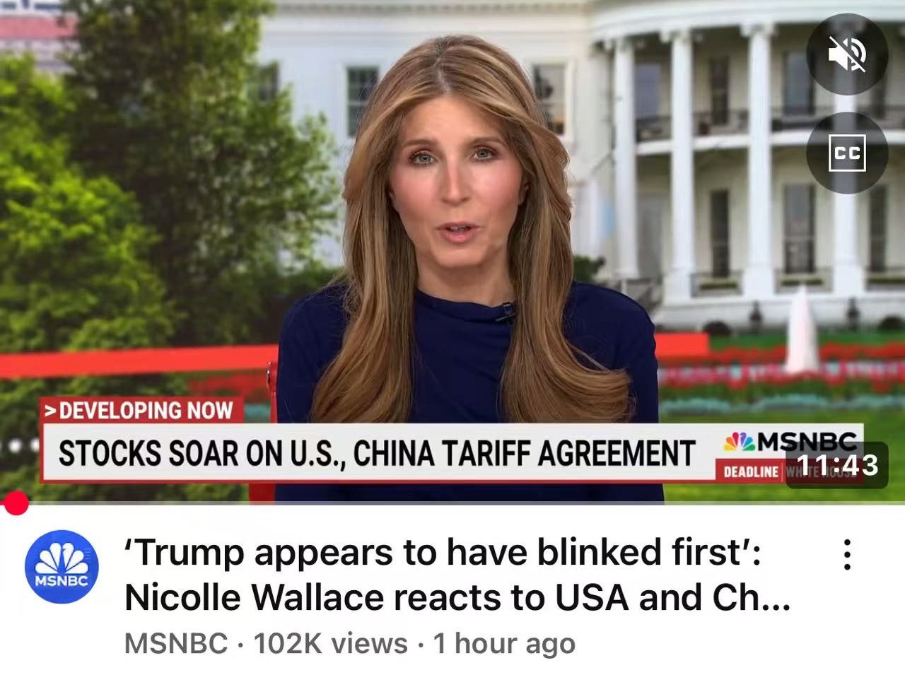 這裏地緣政治的專家多多少少對結果有點不滿,包括中國和美國。因為關税戰真正的痛苦都還沒有傳遞到基層,在地緣政治的角度上來説,對美國的鷹派而言,希望看到的是中國工廠的倒閉,大量員工的失業;而對中國的鷹派而言,覺得很不爽,因為美國的貨架很快會出現缺貨的情況,而大批員工的失業的現象還沒有開始……