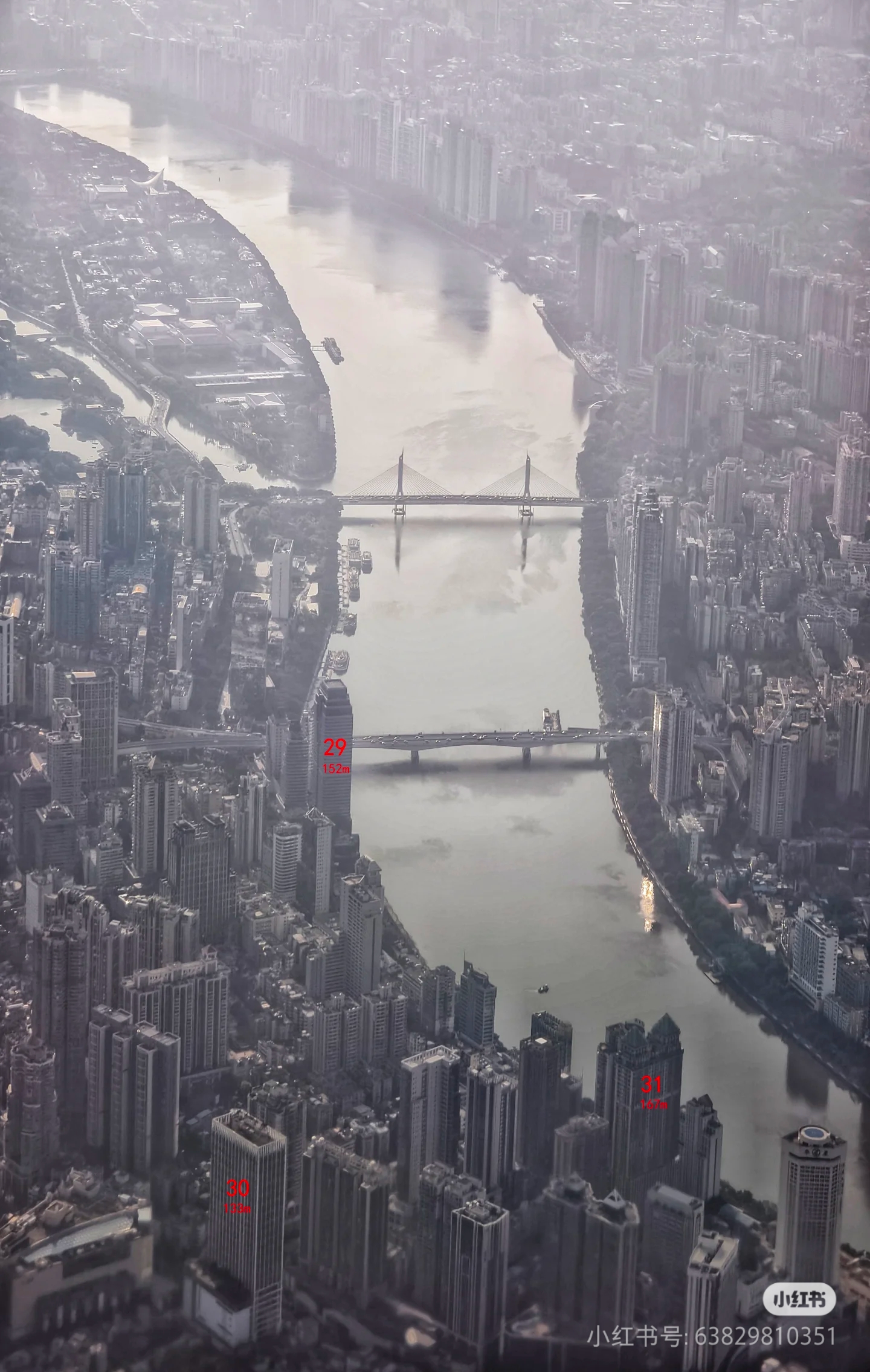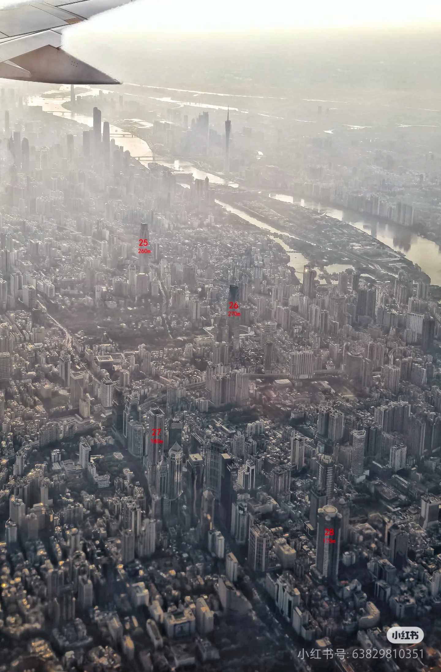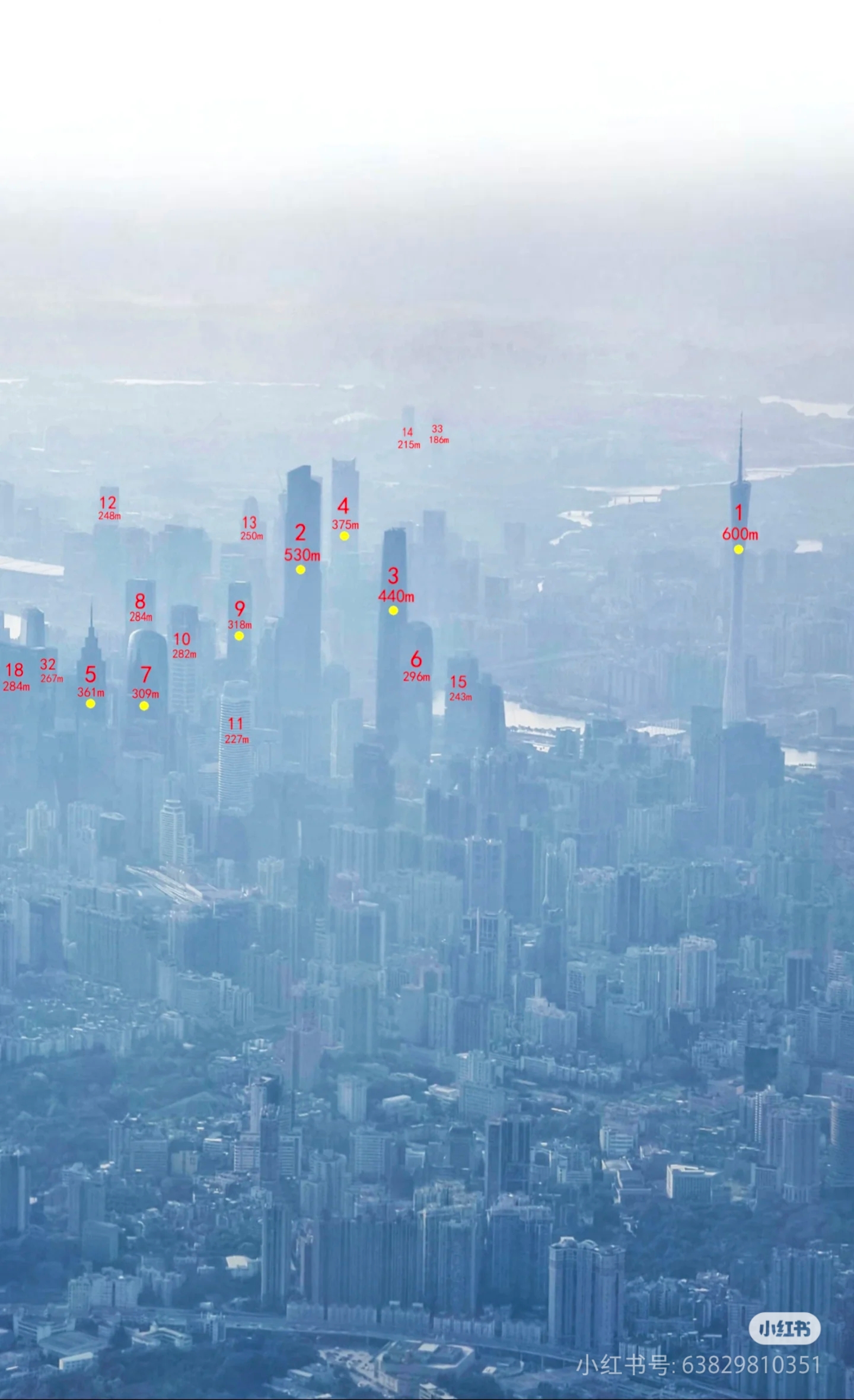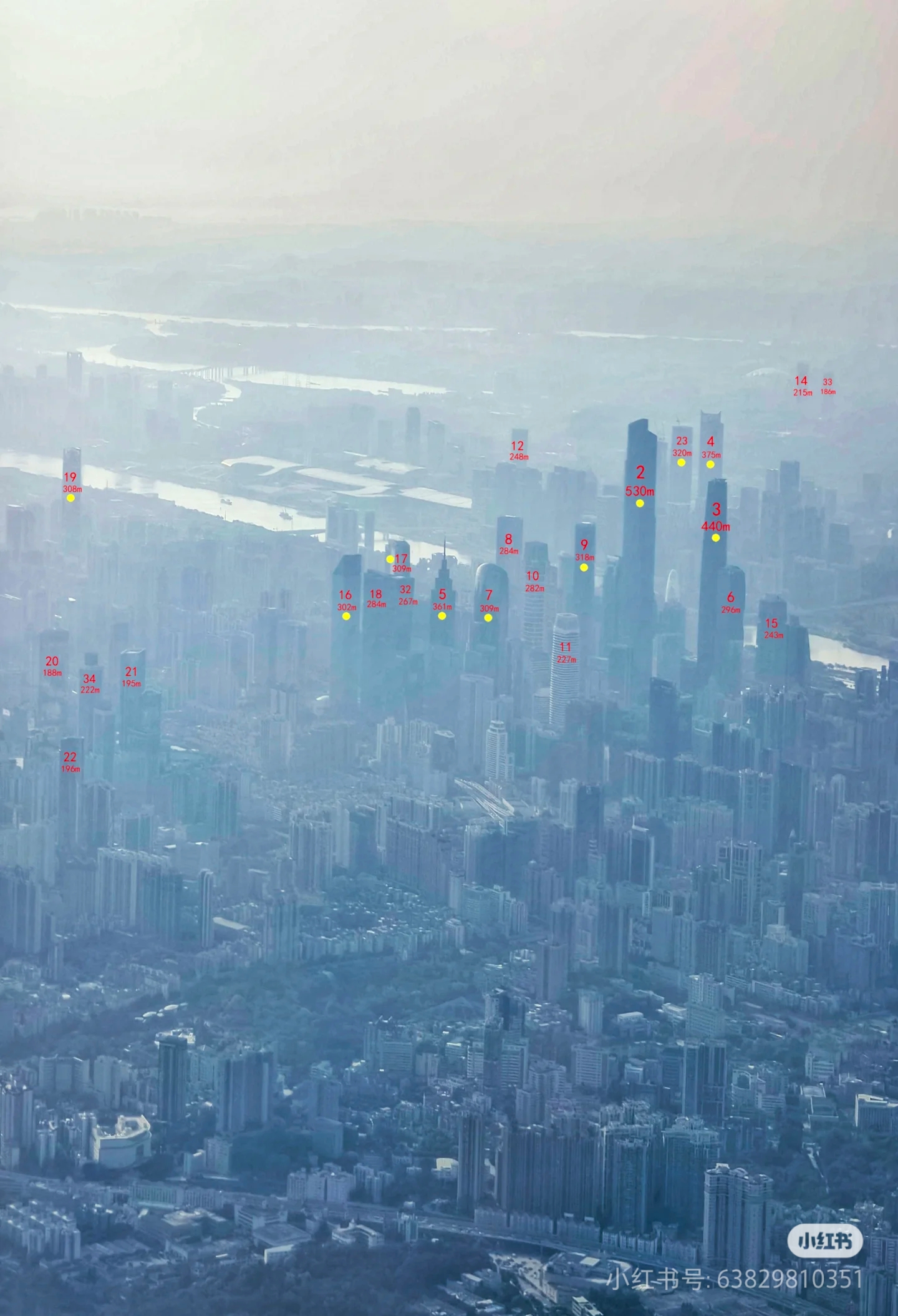 圖片上標號的廣州高樓,當初是憑感覺標號的,與高樓實際排名順序會有出入。未在圖上出現的一些高樓如廣州391米的中信大廈等未列入。圖上超高層大樓基本上在廣州珠江新城一帶,珠江新城是全國300米以上高樓最密集的地方。照片隨拍於海口飛廣州的航班上。