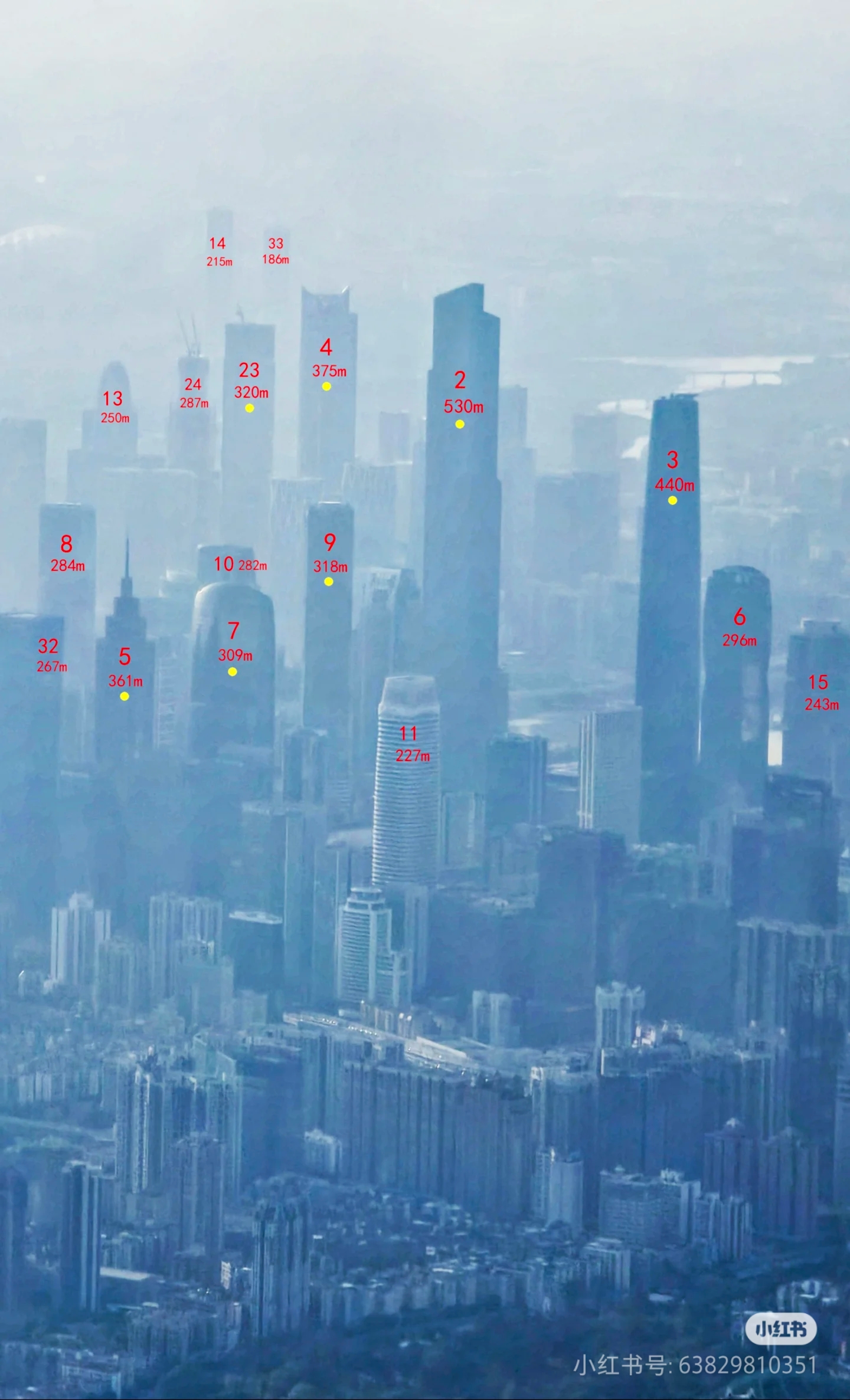 説明:各網友提供的大樓高度數據基本相同或相近,對有差異的,本人基本上採用更高的數據,如相同的大樓,有的説360米,有的説361米,那就採用361米。只有極個別樓採用了相對低些的數據。圖片上標註的大樓高度都是整數,如375.6米,標註為375米;361.9米標註為361米,因為圖上高樓之間空間有限,如標上小數點及後面數字,會比較雜亂,看得眼花。圖上高樓的標號還是跟前幾天發的圖片一樣,根據網友的補充,新增了32、33、34高樓的標號。如有不準確或不正確的地方,希望朋友們糾正補充等,謝謝!