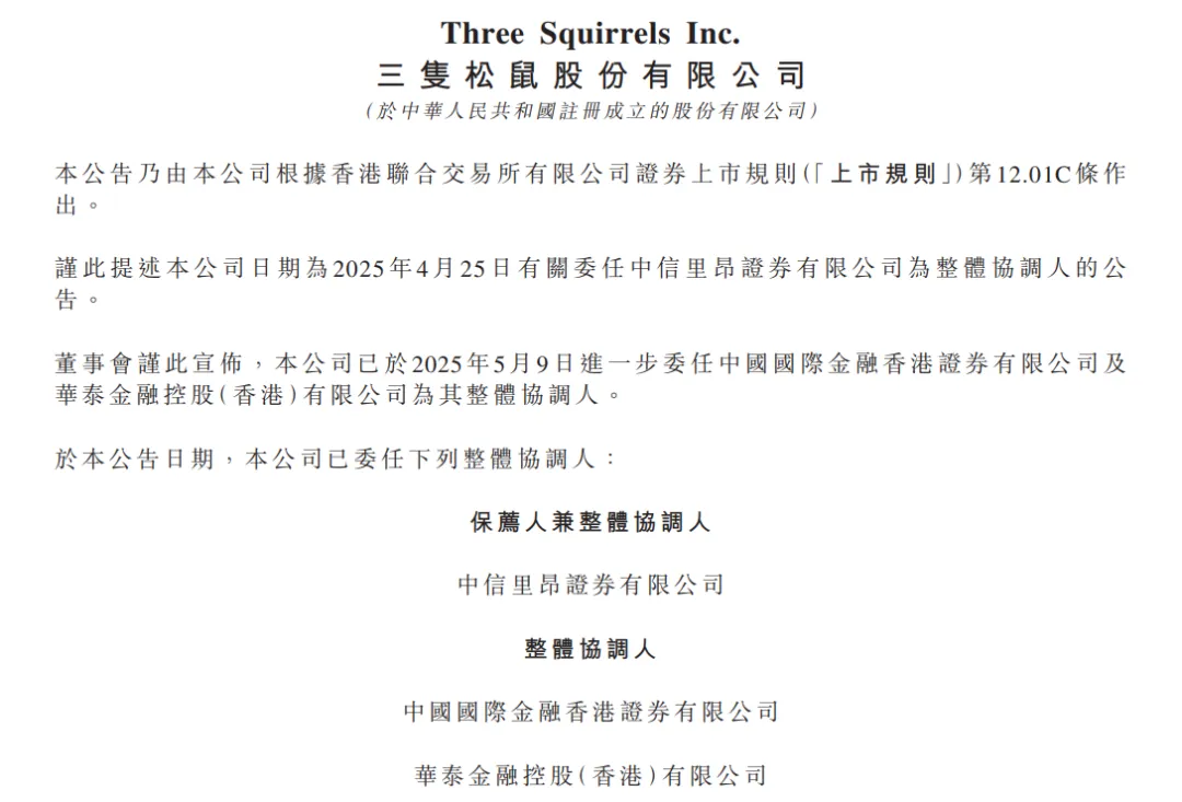 5月9日,港交所文件顯示,三隻松鼠股份有限公司進一步委任中國國際金融香港證券有限公司、華泰金融控股(香港)有限公司為整體協調人。據此,截至公告日期,三隻松鼠已委任中信證券、中金公司、華泰國際為整體協調人。截至5月12日收盤,三隻松鼠(300783.SZ)報27.25元/股,市值109.27億元。