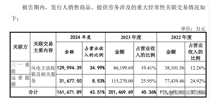 三一重能與德力佳的關聯交易也是此次IPO之旅頗受關注的地方。報告期各期,德力佳的重大經常性關聯交易金額分別為11.55億元、20.15億元和16.17億元,佔營業收入的比例分別為37.18%、45.36%和43.51%。