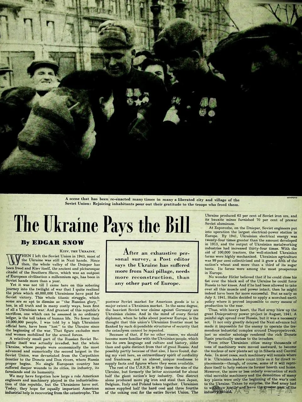 經過郵報編輯(桑乾注: 指埃德加·斯諾本人)詳盡的個人調查,烏克蘭遭受納粹劫掠後,比歐洲任何其他地區都更需要重建。
