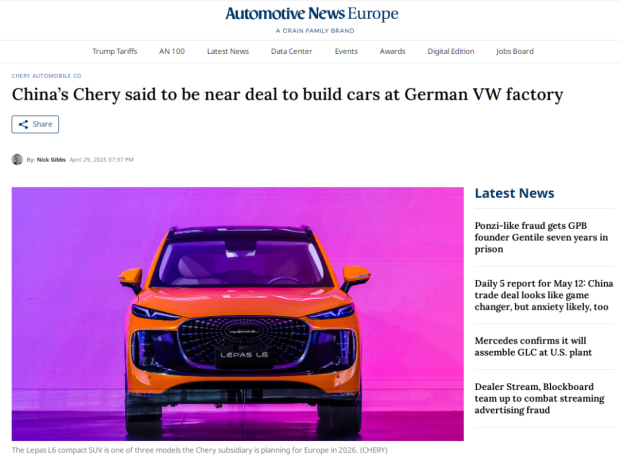 #奇瑞,即將與大眾集團達成協議,要在大眾的德國工廠生產新車型。