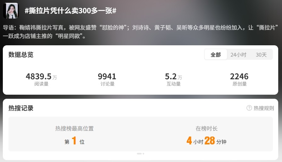 近日,話題“撕拉片憑什麼賣300多一張”登上微博熱搜榜第一名,引發網友熱議。截止到5月13日下午,該話題的閲讀量已高達4839.5萬,且相關內容在小紅書、抖音等平台上亦得到了網友的高度關注。