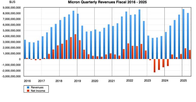 縱觀美光公司2016 年至今的收入和利潤,可以發現明顯的短缺和過剩、高峯和低谷模式,下圖是 DRAM 和 NAND 市場的特徵。