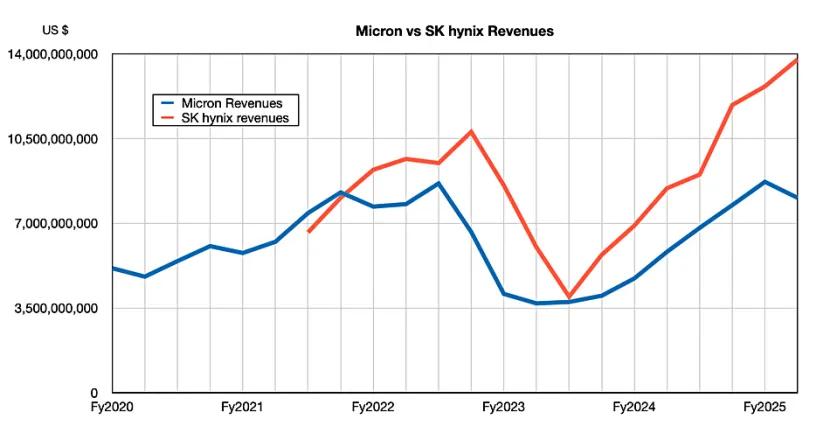 目前有兩家公司高度專注於DRAM 和 NAND 的生產——美光科技和SK 海力士。兩家公司都在企業級 SSD 和高帶寬內存領域展開激烈競爭,但都通過早期龐大的業務擴張,以複雜而間接的方式,在兩個市場中保持着各自的定位,期間既有失誤,也有靈光乍現。