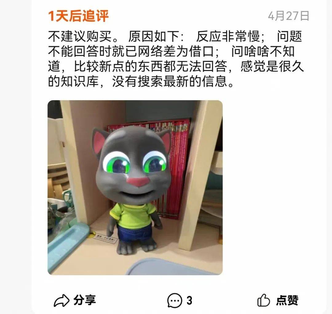 在淘寶上,該款產品也褒貶不一,有用户認為該玩具是一款非常好的AI玩具,也有消費者認為該款玩具反應非常慢,問啥啥不知道。