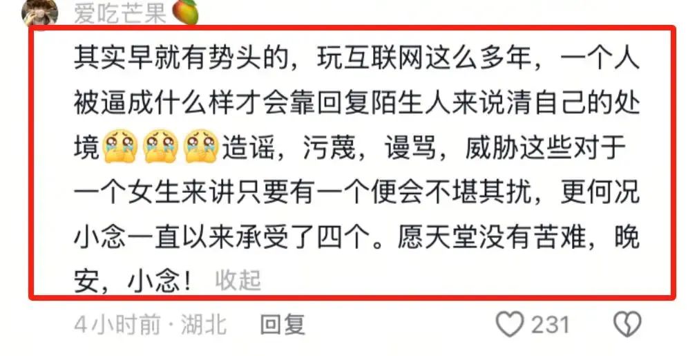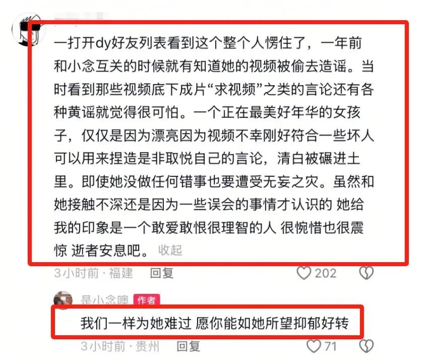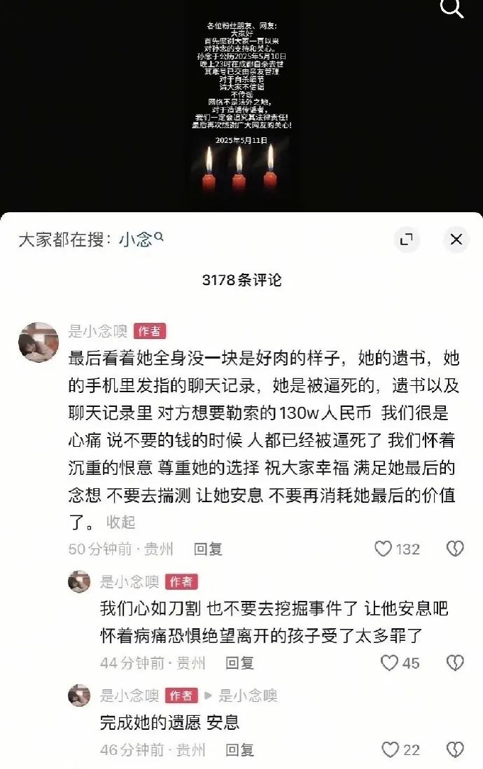 隨後就有疑似親屬的人,在賬號底下評論數條披露真相,表示小念是被人勒索130萬,然後走投無路走向極端。