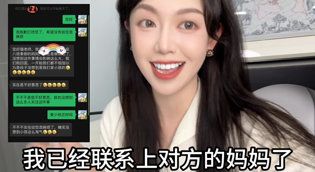 貓一杯那時則更新了秦朗事件的後續,表示自己已經聯繫上了秦朗同學的媽媽。