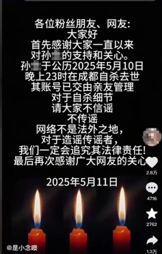 5月11日,百萬粉絲網紅**“是小念噢”**,在dy上發佈一條視頻,稱該博主姓孫,已經與5月10日23點去世。