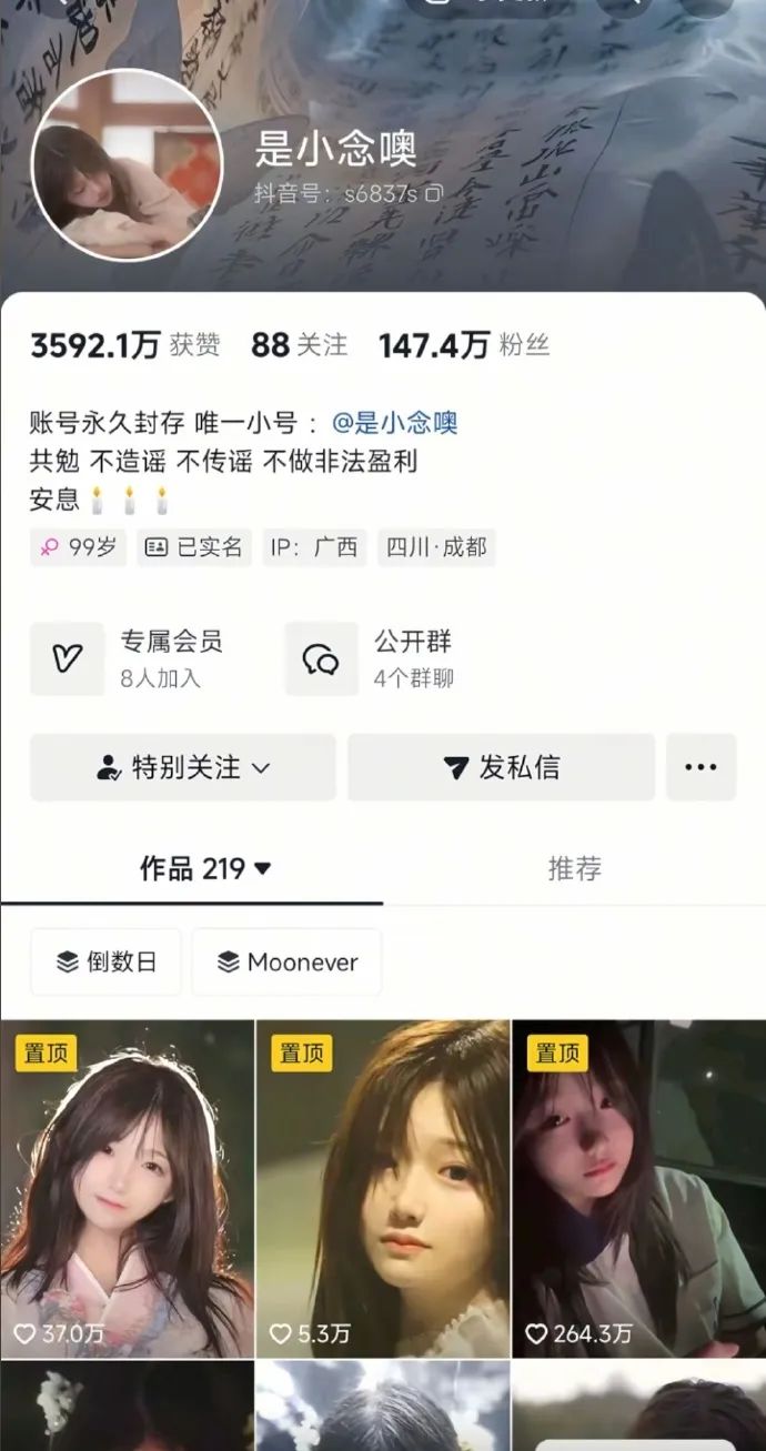 目前小念因涉嫌編造謠言,擾亂公共秩序,已被立案調查,dy賬號也已被封禁。