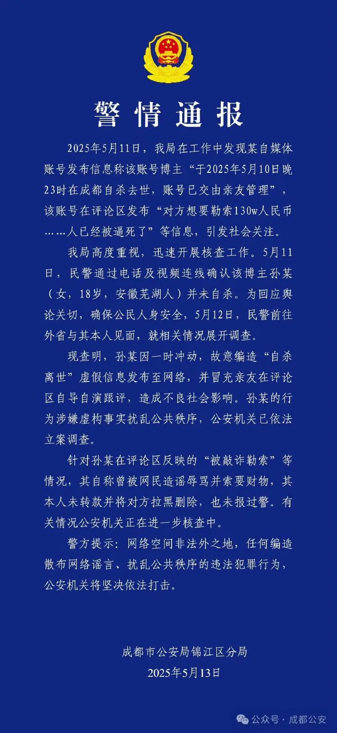 網友都無語了,為了流量炒作也得多少有點腦子吧,炒作其他內容,官方管不管還能看運氣(不是説炒作是對的),編個“遭勒索後自殺”,這種事只要炒作成功,官方必然介入。