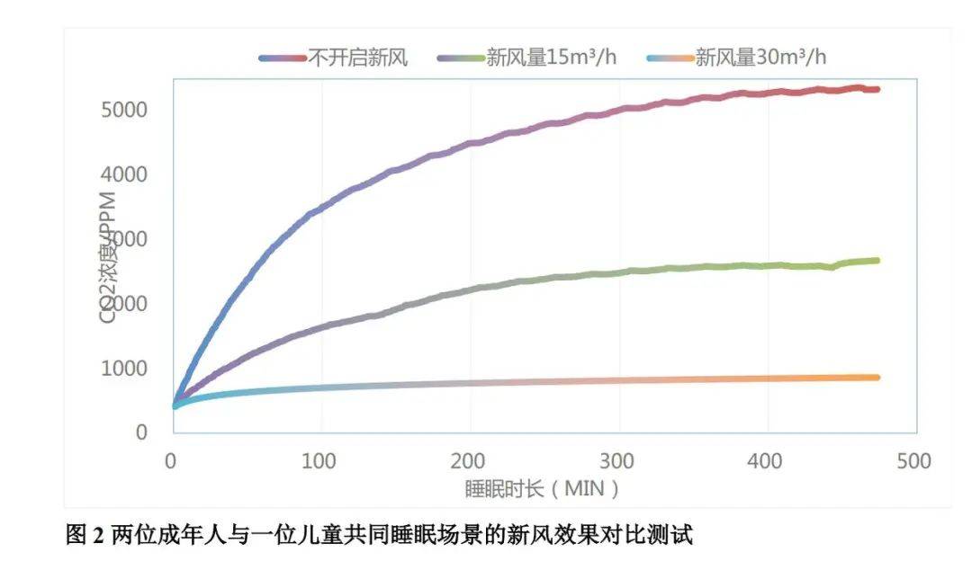 在由兩名成年人+一名兒童的實驗場景裏,新風系統更是將二氧化碳濃度從5300ppm降低至800ppm,降幅為83.8%,四組實驗數據均達到了符合國際安全閾值的標準。