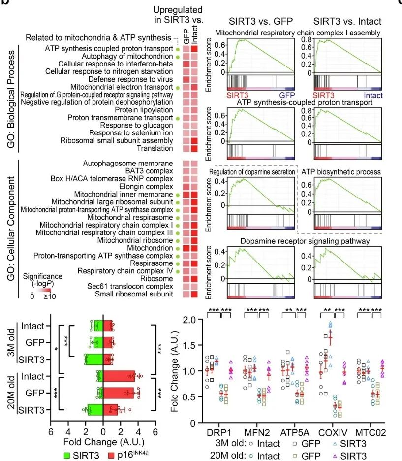 圖注:SIRT3治療顯著提升了老年小鼠大腦黑質中多種線粒體關鍵蛋白的表達,並降低了衰老標誌物p16的水平