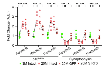 而這種來自大腦黑質的積極信號,也確實傳遞到了肌肉組織——接受大腦SIRT3治療的小鼠,其骨骼肌中的衰老標誌物p16水平也相應降低了,並且維持神經肌肉連接的關鍵蛋白——突觸素的表達也更好了。