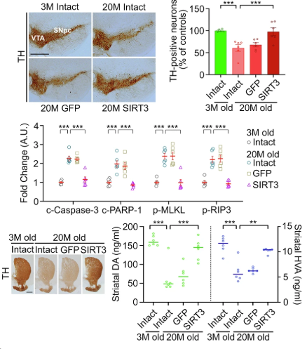 特別的是,在這些神經元中,與線粒體活力息息相關的“長壽蛋白”SIRT3的水平也大幅下降了,並且,這種下降在黑質區域尤為明顯,比海馬、皮層等大腦其他區域更嚴重。
