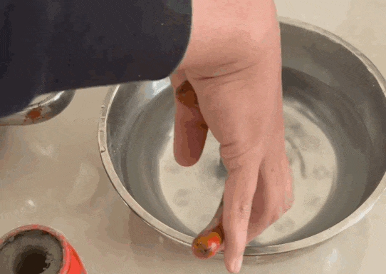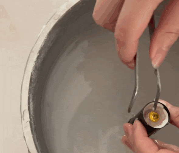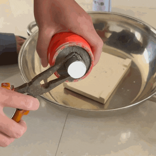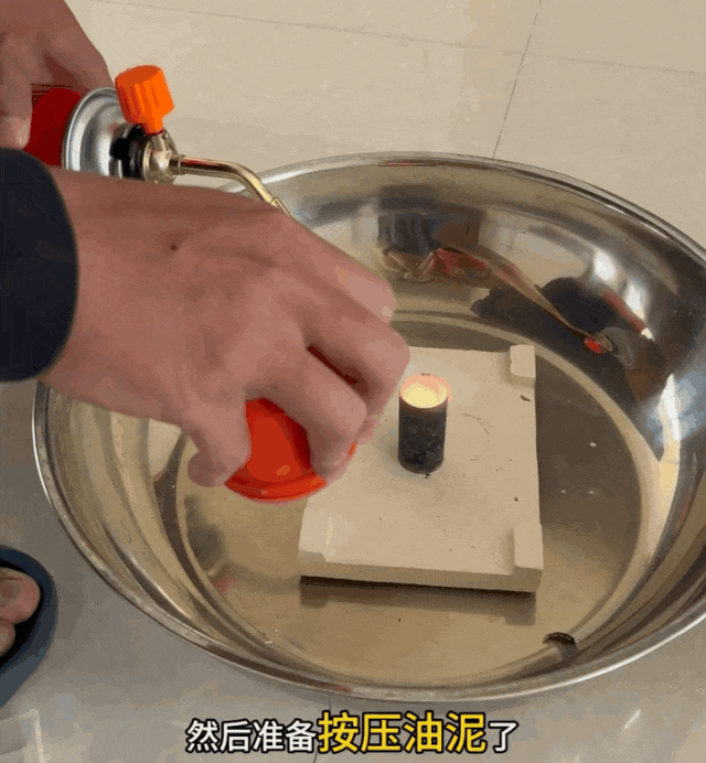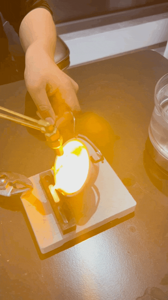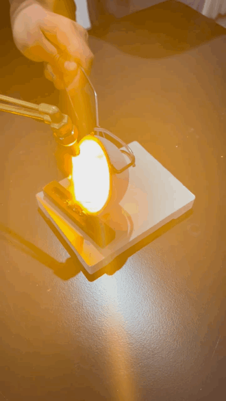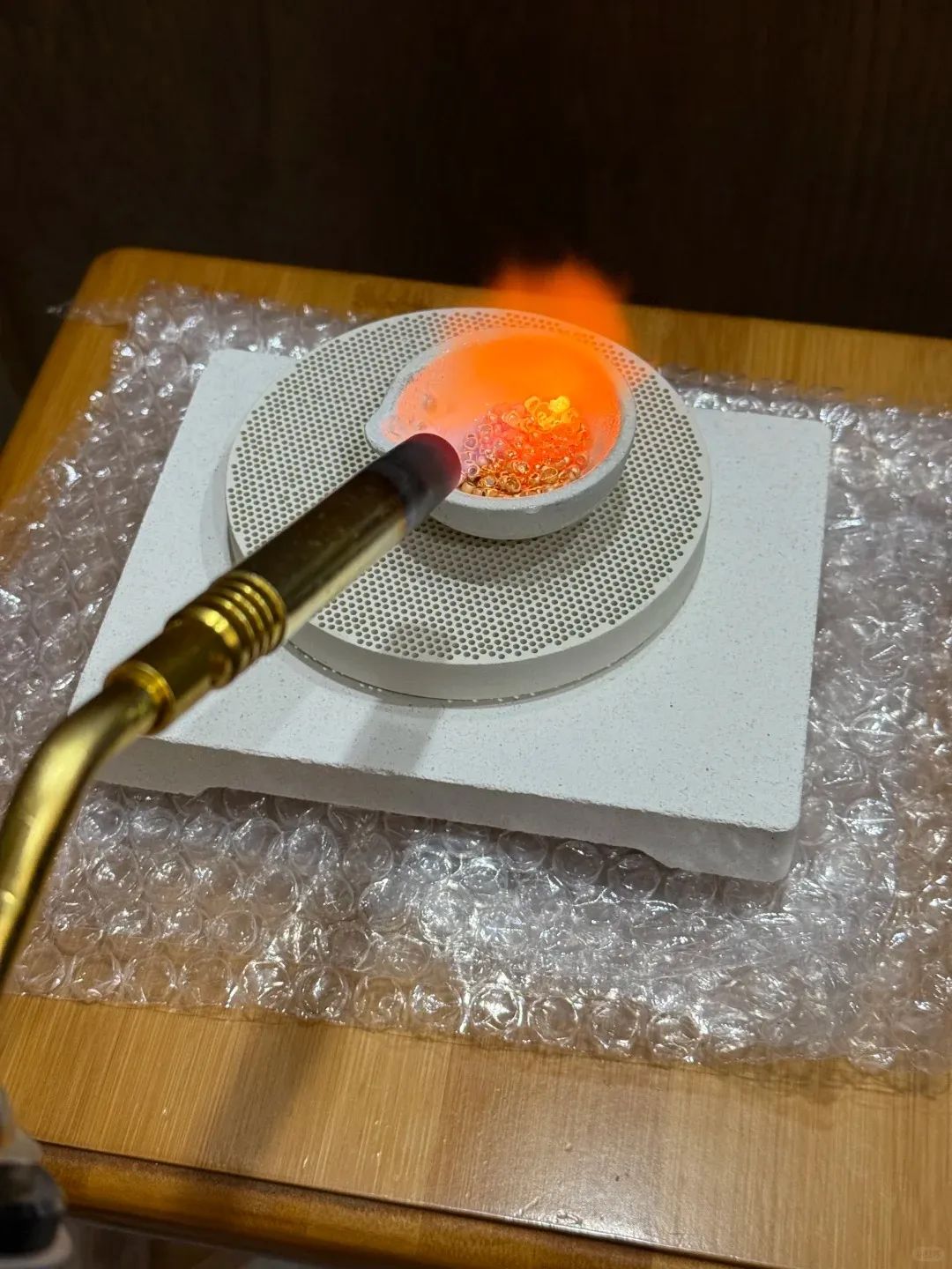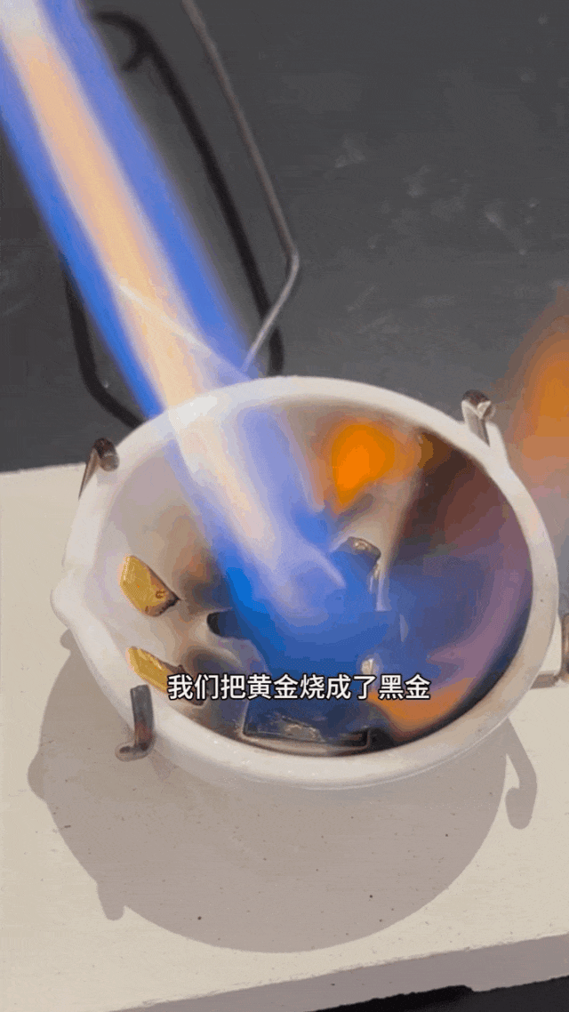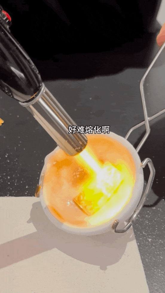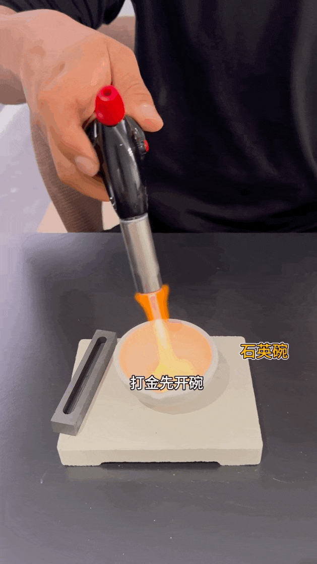 將金子放在石英碗中,拿出噴火槍一頓猛燒,讓它被熔化成液體。